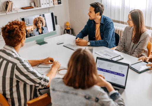 Four people sit around a table in an office, having a video conference with a fifth person on a monitor. Laptops, papers, and notebooks are on the table.