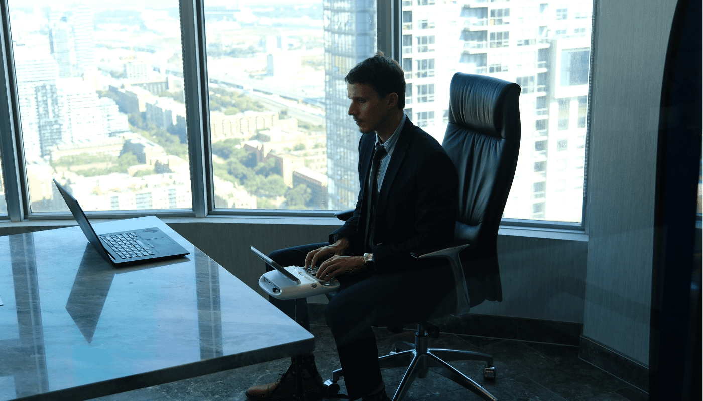 A man in a suit sits on an office chair by a desk in a high-rise office, using a typewriter and facing a laptop, with large windows overlooking the city.